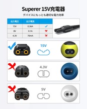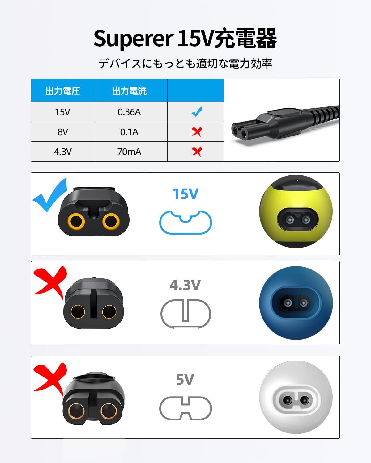 [商品情報] 入力:100V-240V 出力:15V 0.36A 。注意事項:8V/5V/4.3Vには適合しません。シェーバーの互換性のある電圧とコネクタを確認するには、画像を確認してください.。付属品:ACアダプター(1個)、1.8 m電源ケーブル(1本)