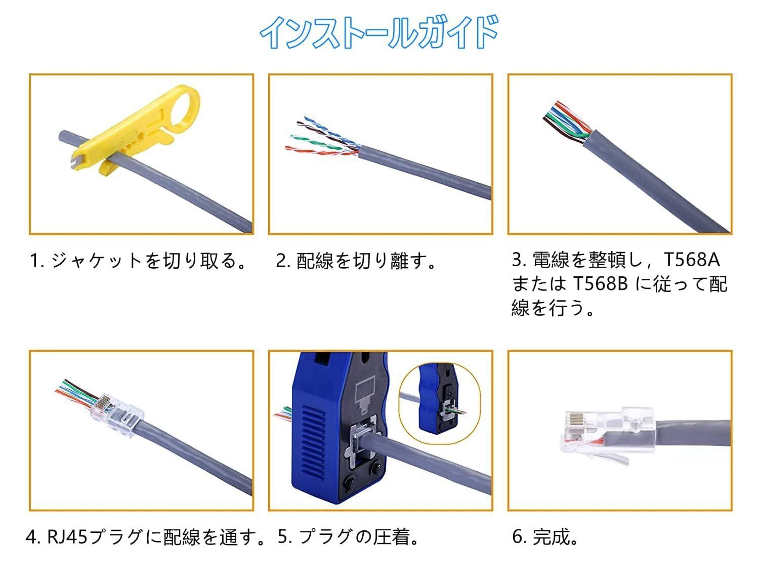 【単線ケーブル・より線ケーブル両対応】 LANケーブルには短いものから長いものまでさまざまあります。それと同様により線と単線とよばれるものがあります。 より線は、7本前後の細めの線で構成されていて、柔らかく配線の取り回しがしやすいのが特徴です。単線は1本の線で構成されていて、より線に比べノイズを受けにくいため、ケーブル長が長い(20m以上)の場合に良いとされています。ただし、ケーブルが固くなりやすく、配線がしにくくなってしまいます。当ストアのLANコネクタは単線・より線どちらにも対応しているため、配線等で使い分けが容易にできるので大変便利に使用が可能です。