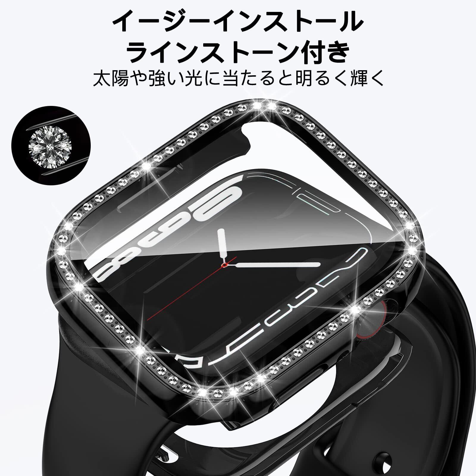 アップルウォッチ 保護 カバー 45mm 薄型 防水 強化ガラス Apple Watch 一体型 二重構造 ケース Series 9 8 7 クリスタルダイヤ付き レディース iWatch ケース PC環保素材 (ブラック 45mm)