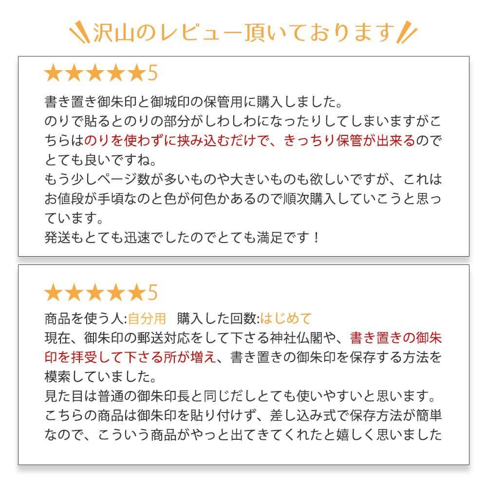 寺社を参拝するだけでなく、仏像鑑賞やパワースポット巡りの楽しみの一つ『御朱印集め』 大切な御朱印をいただくのに欠かせないのが『御集印帳』 参拝の際、あらかじめ用意されている『書き置きご朱印』の四隅をジャバラ式台紙に差し入れて保管することができるご朱印帳です。 クリアポケットやフィルムを剥がして使用するタイプとは違い環境に配慮した紙製で、ご朱印の持つ雰囲気をなるべく損なわないようにしました。 貼り付けないので入れ替えが自由自在で、倍サイズ(見開き)の『書き置きご朱印』も保管できます。 ジャバラが開いてしまわないように留めておくゴムバンドや裏表紙(両面とも)には拝観券などが収納できるポケットが付いています。 また、近年増えた登城の記念となる「ご城印(ごじょういん)」集めとしても使えます。 台紙の白い部分に記念スタンプの押印やペンなどで書き込んだりもできます。 ※ご朱印の直書き用には使用しないでください。 ※『書き置きご朱印』が切り込みより大きい場合がありますので適宜カットするか、折るようにしてください 。【実用新案登録 第3226091号】 「いちばん売れてる御朱印帳」と同柄が新登場!! ランキング受賞常連のカバー付き御朱印帳で特に人気の10柄を、書置き御朱印帳でも作りました!! 豊富な人気柄はハッピーストアだけのオリジナルです! (付属のゴムバンドは全て紺色になります) 是非、お寺、神社巡りに是非ご活用下さいませ。 サイズ】173×123mm 【素材】紙(表紙/中身)、ゴム、合成皮革(ゴムバンド) 【重量】105g 【カラー】てまり 紺 / てまり 黒 / 扇に波 黒 / 扇に波 鉄紺 / 花御所車 黒 / おまつり花火 赤 / おまつり花火 黒 / 舞桜桃 桃色 / 舞桜桃 淡藤色 / 梅霞文 【内容】朱印帳 1冊 ゴムバンド1個 【備考】蛇腹式 両面18枚収納