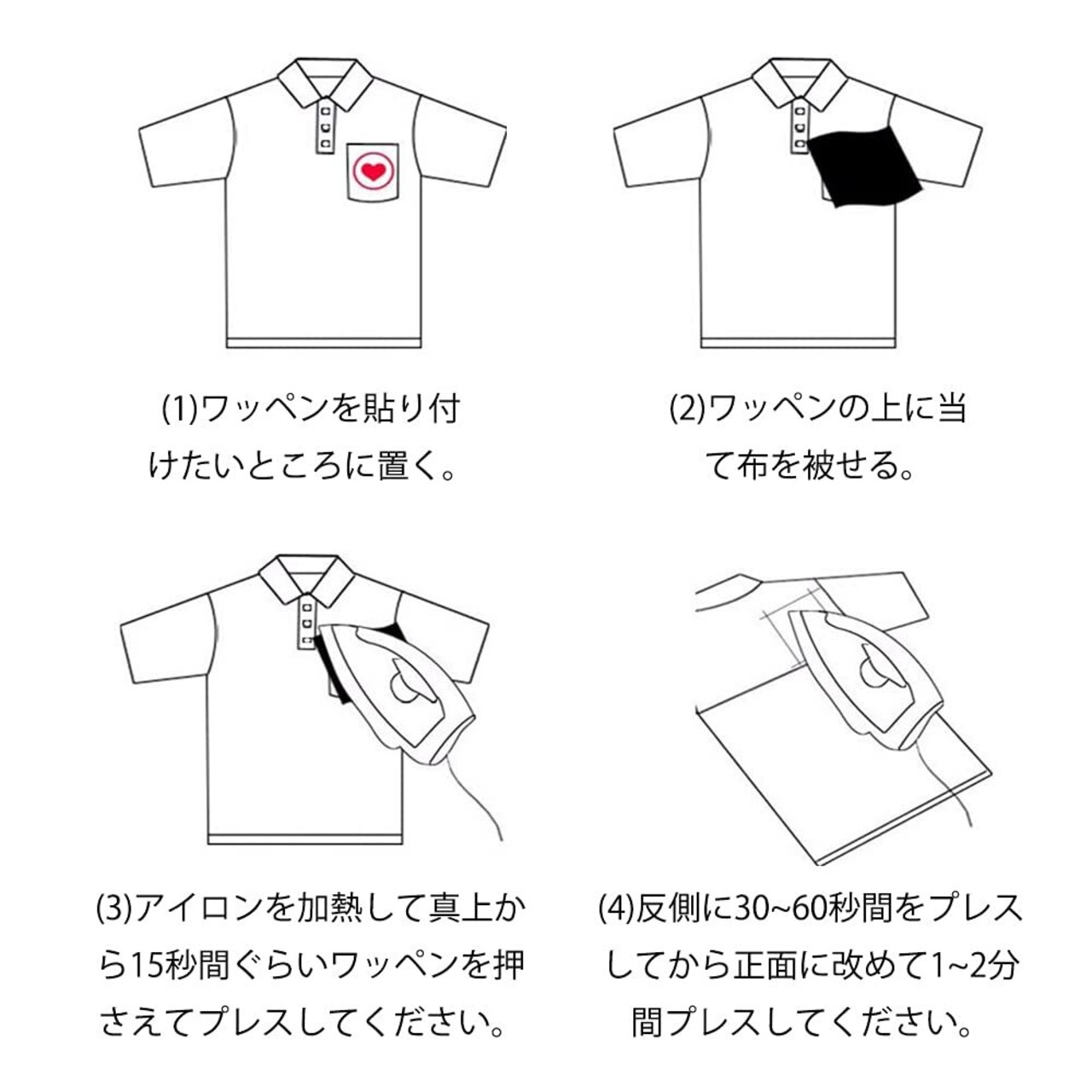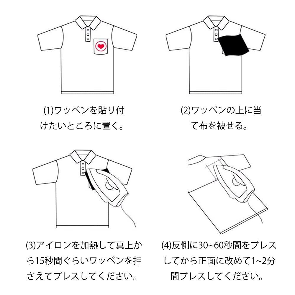 4.使用方法:(1)ワッペンを貼り付けたいところに置く。(2)ワッペンの上に当て布を被せる。(3)アイロンを加熱して真上から15秒間ぐらいワッペンを押さえてプレスしてください。(4)反側に30~60秒間をプレスしてから正面に改めて1~2分間プレスしてください。