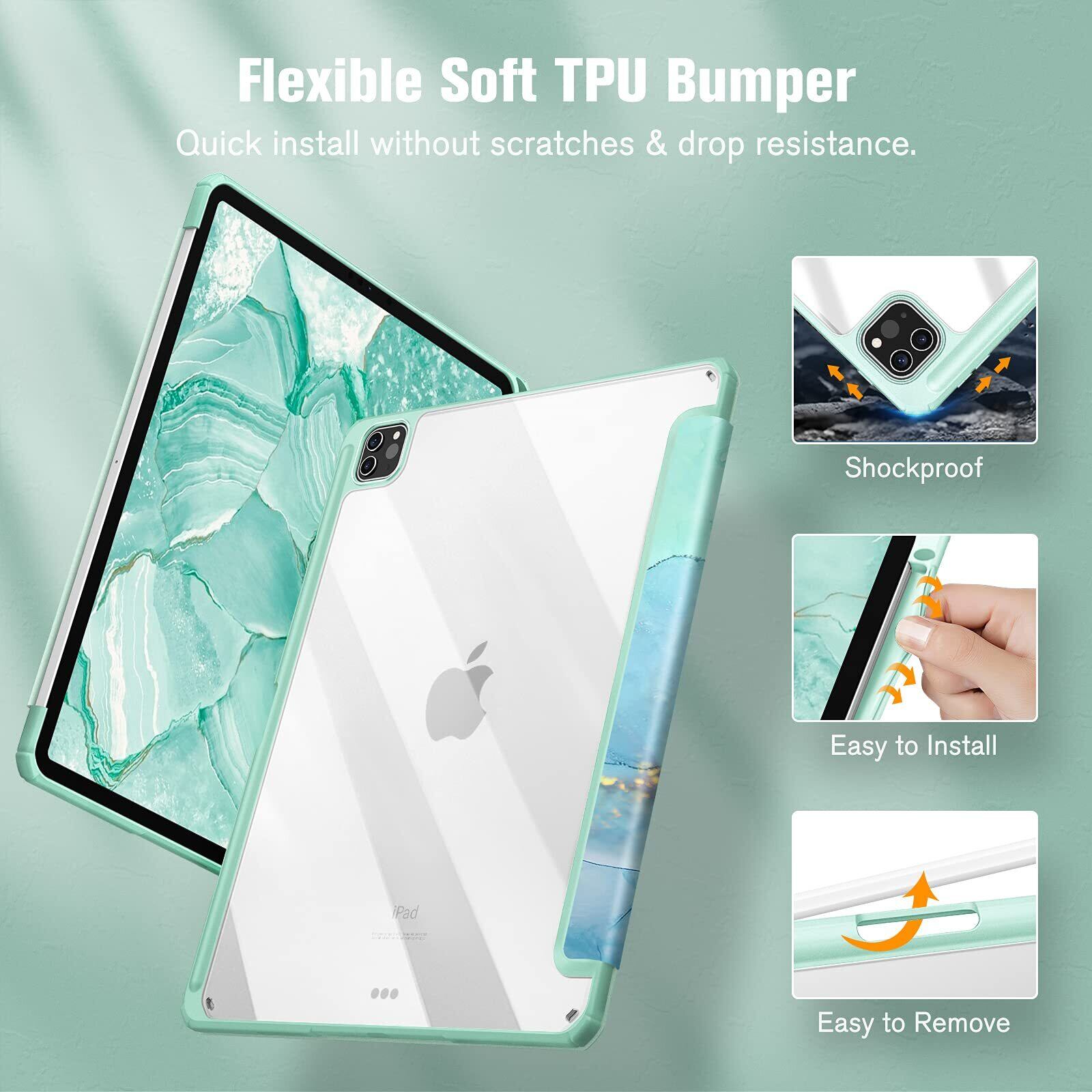 Fintie iPad Pro 12.9 ケース 2022/ 2021/ 2020/2018 12.9インチ 透明バックカバー Apple Pencil 収納可能 Apple Pencil 2 ワイヤレス充電対応 三つ折スタンド スリープ機能 軽量 薄型 傷つけ防止 PU合成レザー TPU (モデル番号A2378、A2461、A2379、A2462)(柄 X マーブルグリーン)